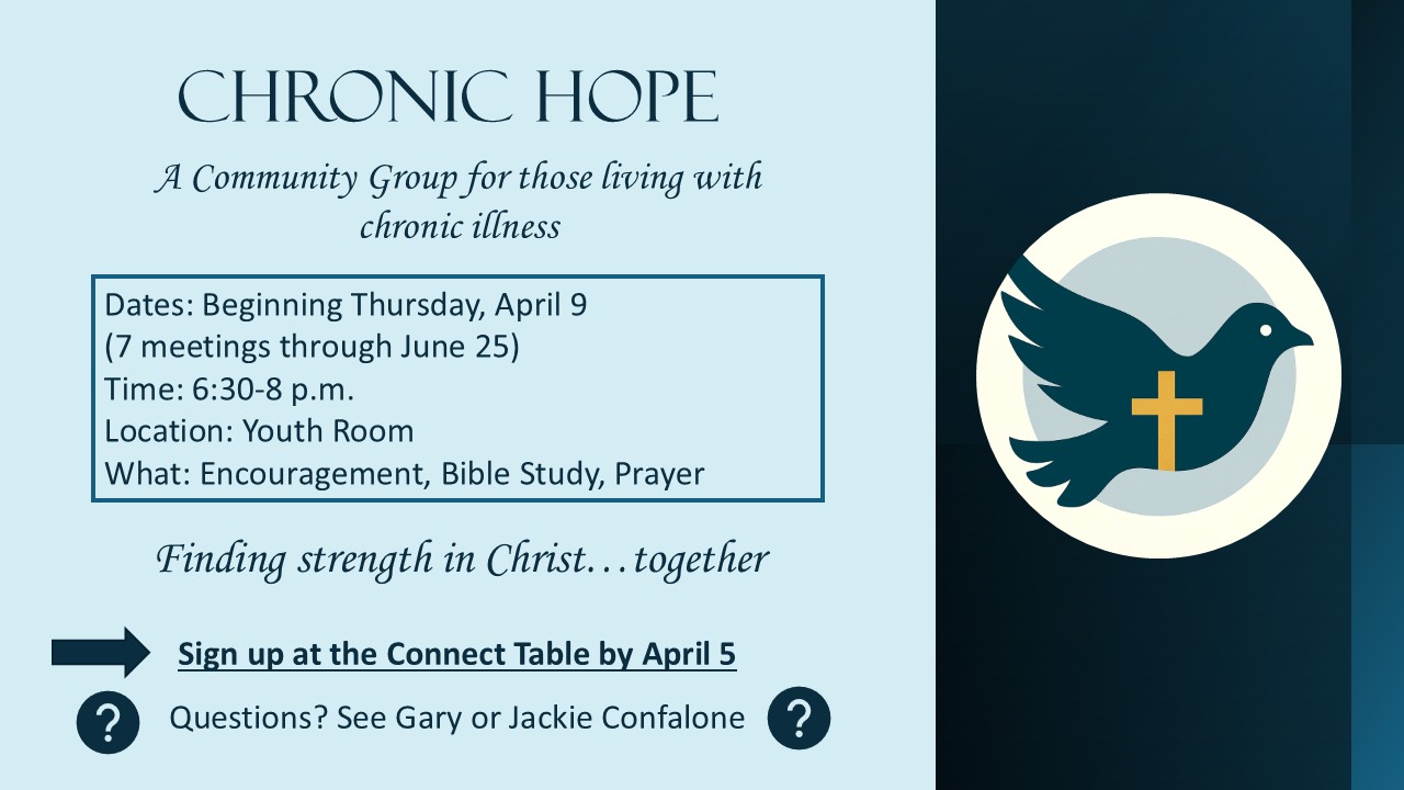This a new ministry at CEC that is a Community Group for those with chronic illness. Anyone who has a chronic illness can attend along with anyone who supports/cares for someone with a chronic illness. We'll meet in the Youth Room starting on Thursday, April 9th.. If you or someone you love is walking through […]